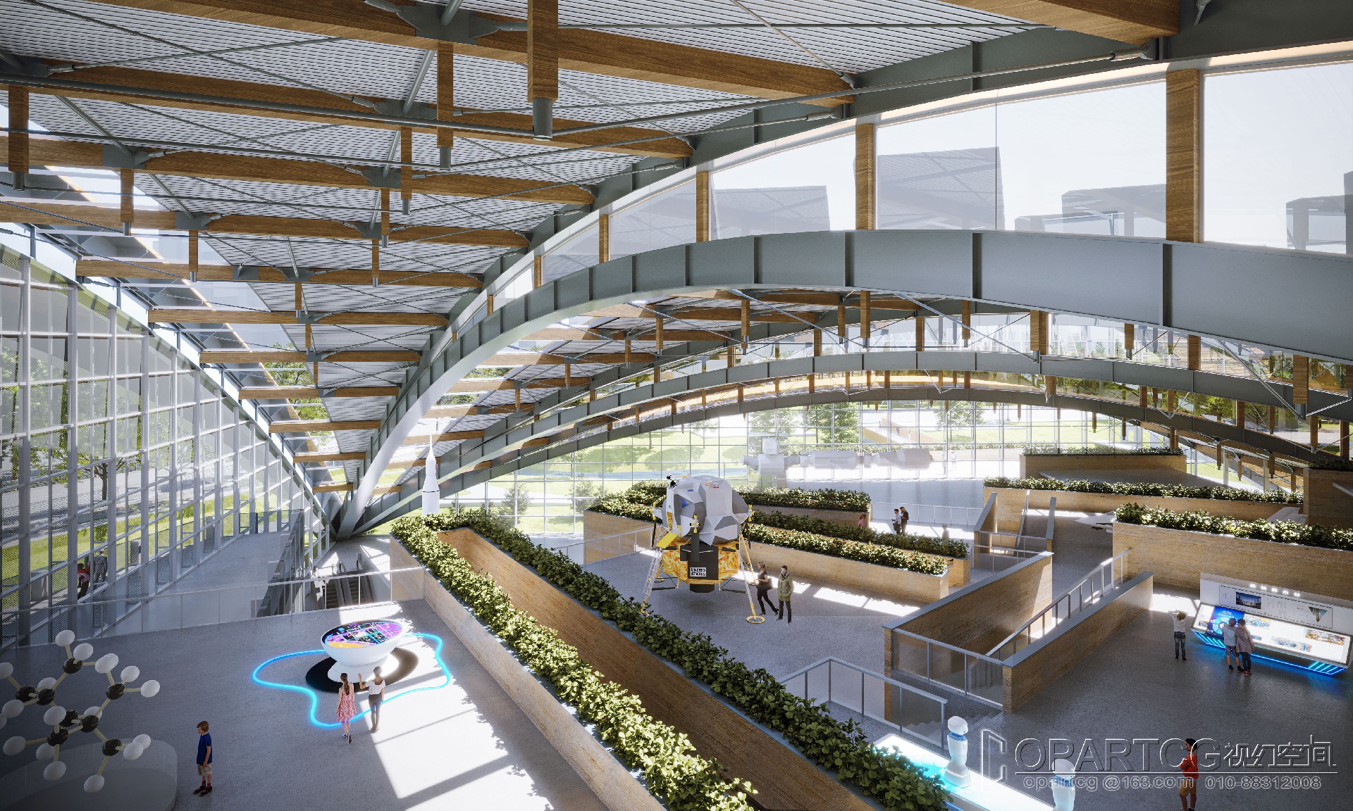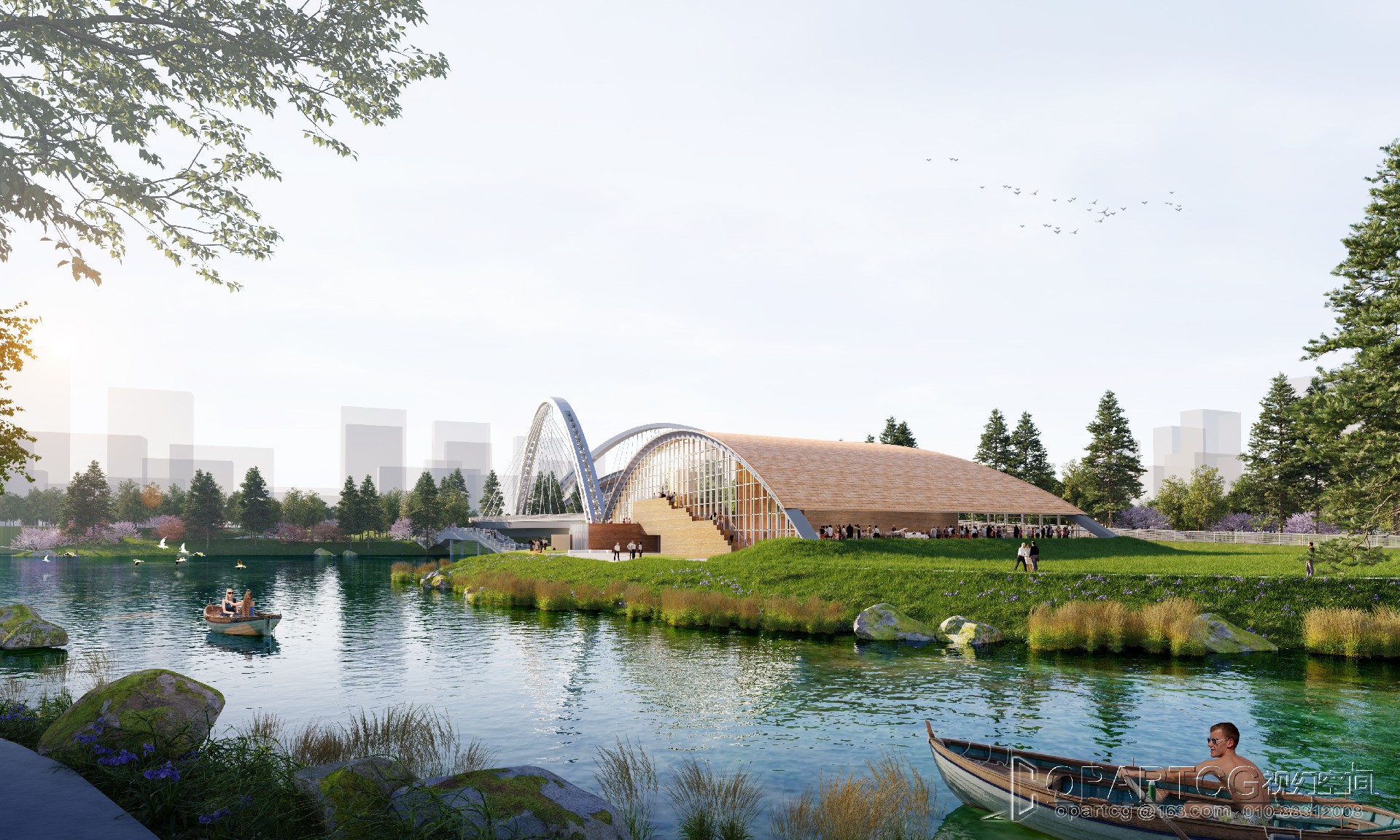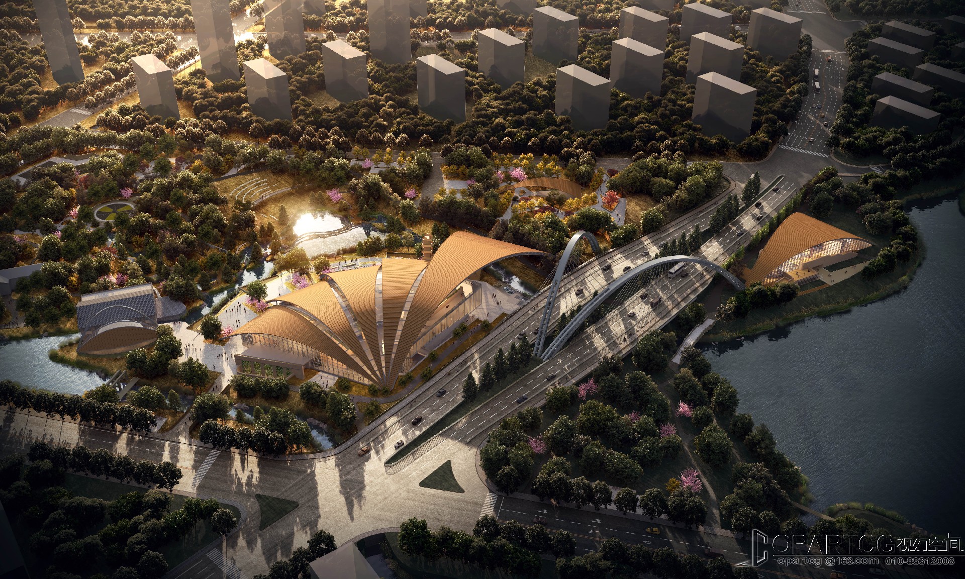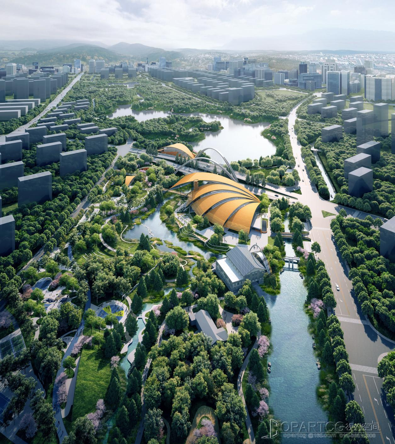 The main hall in the north area of the popular science center is located in the southeast of Shouyuan road and Dongdi Road, facing the water on three sides, and the arched roof crosses Shouyuan lake to the South; The South sub Hall of the popular science center is located in the northwest of Dongdi road and the first planning branch road; The outdoor exhibition shed is located in the east of the main hall; One management room and public toilet are located in the south of the plot, and one public toilet is located in the east of the plot.
